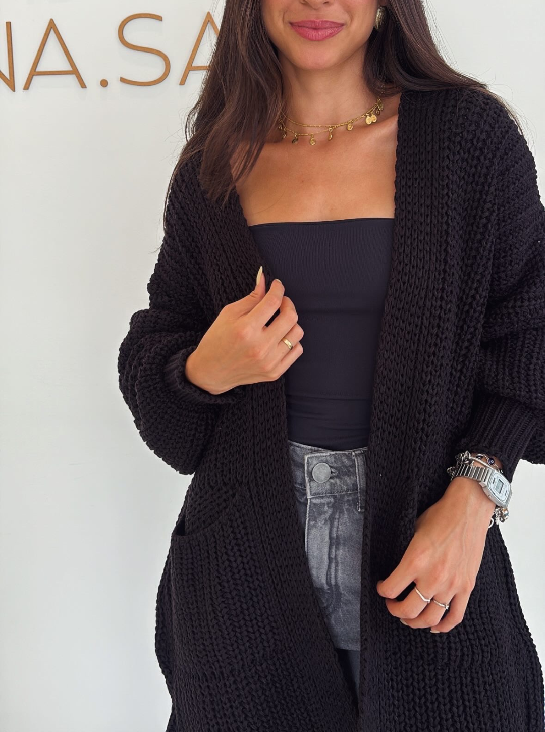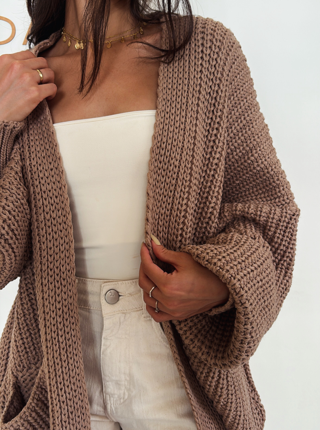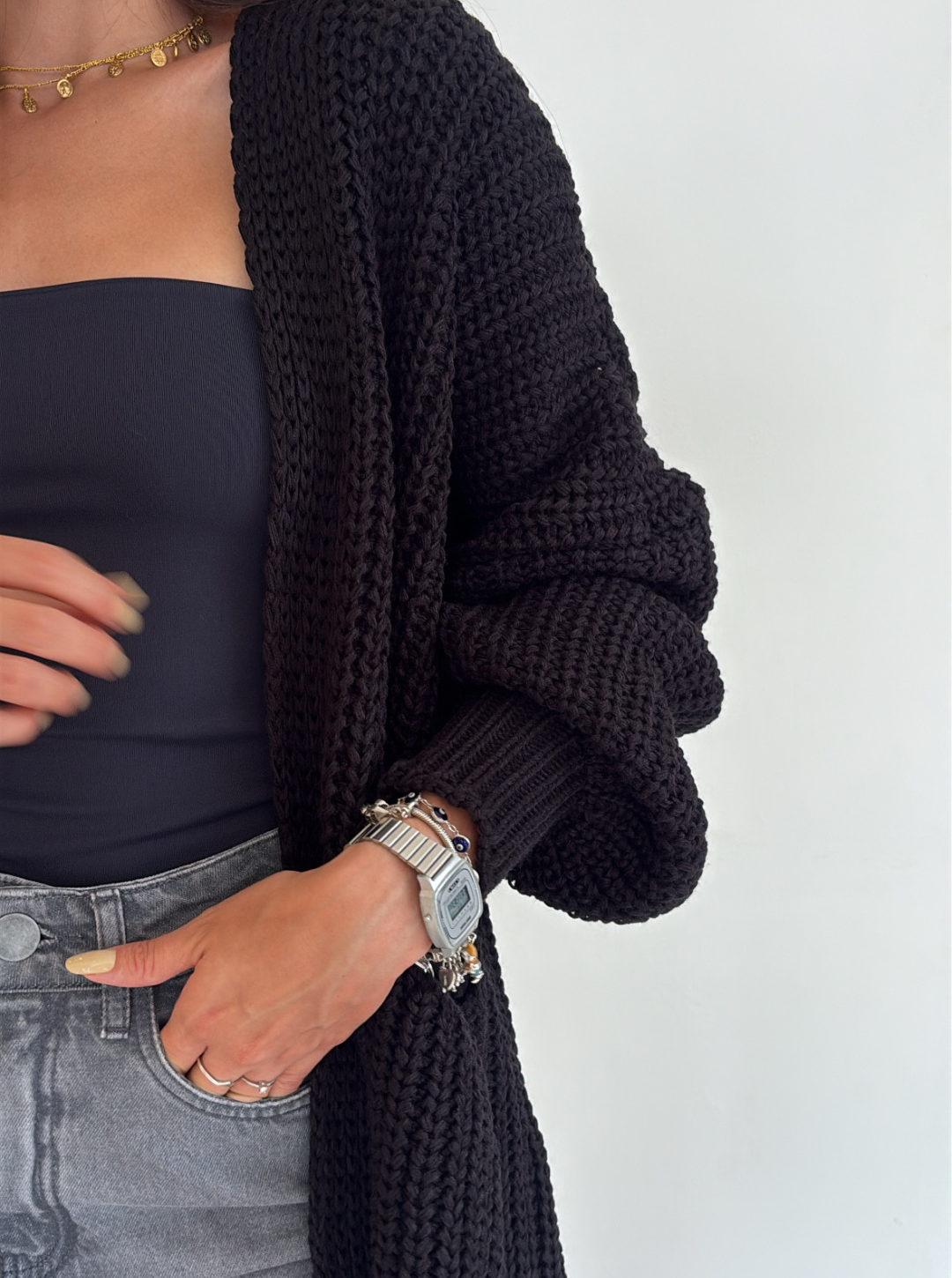 Cardigan alongado, bem amplo, com textura que lembra crochê e fio encorpado. Tem bolsos frontais e um caimento que faz o look acontecer sem esforço.